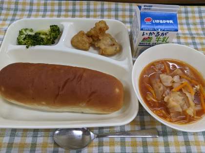 11月7日(月)のこんだては「白身魚フリッター、ミネストローネ、ブロッコリーのサラダ、おさつパン、牛乳」です。