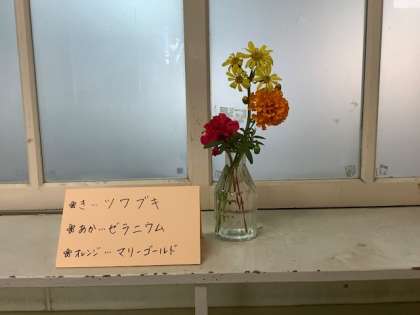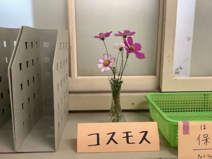 保健室前の廊下には、いつもお花が活けてあり、こころがホッとします。
