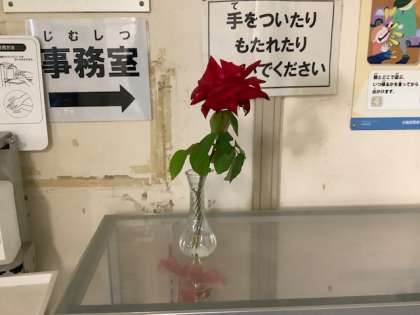 職員室前には、深紅のバラが暗い廊下を明るくしてくれています。