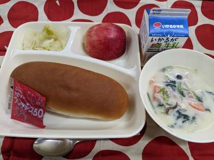 11月9日(水)のこんだては「きのこのクリームシチュー、キャベツのピクルス、りんご、コッペパン、いちごジャム、牛乳」です。
