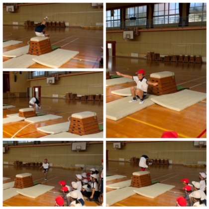 上手に跳べているお友達の演技を見てコツをつかみます。
