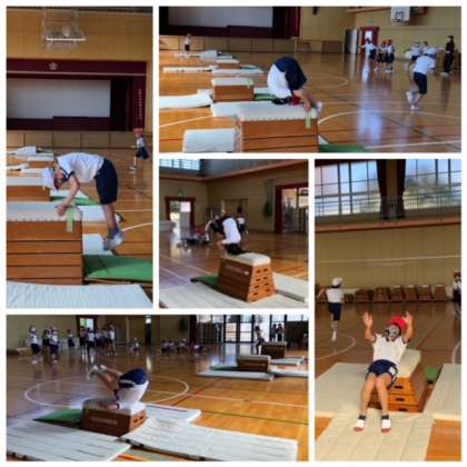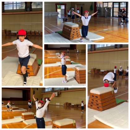 ロイター板をジャンプした後、一瞬でいいのでとび箱を見てから回転に入ること。着地を意識してポーズを決めること。