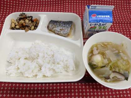 11月10日(木)のこんだては「さごしのごまじょうゆかけ、五目汁、大豆の煮もの、ごはん、牛乳」です。