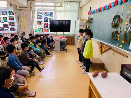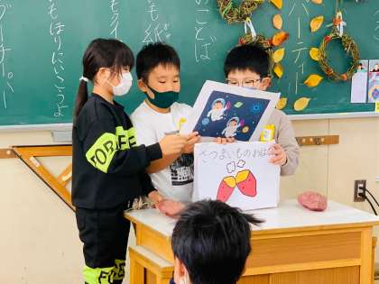 さつまいもについて、紙芝居で分かりやすく1年生に伝えた後は、クイズで楽しく復習します。