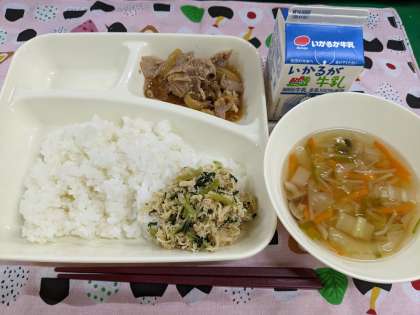 11月11日(金)のこんだては「豚肉のスタミナ焼き、すまし汁、とりなっ葉いため、ごはん、牛乳」です。
