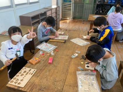 はじめて図工室で、げんのうを使いました。想像力を広げながら、木のパーツを釘で止めていきます。素敵な作品ができました。