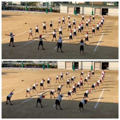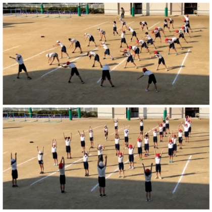 校舎から見学してて、とても美しいラジオ体操なので写真を撮りました。