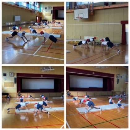 体育館でマット運動をしています。