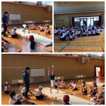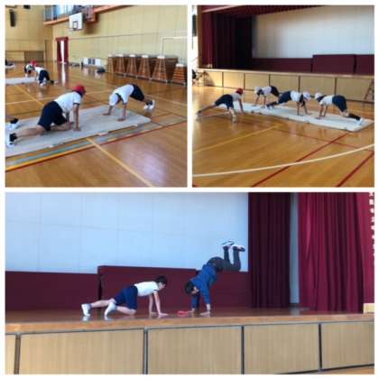 この練習から、倒立前転の練習に移ります。しっかりとした姿勢がとれているお友達の演技を見て確認しています。