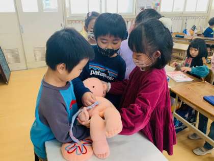 今日は、4kgの重さのリュックサックを体の前につけて妊婦さんの体験をしたり、赤ちゃん人形を抱っこしたりしました。