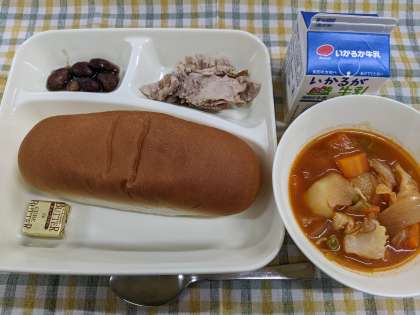 11月16日(水)のこんだては「豚肉のガーリック焼き、ケチャップ煮、うずら豆のグラッセ、コッペパン、バター、牛乳」です。