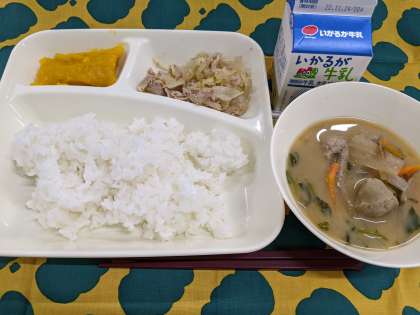 11月18日(金)のこんだては「豚肉と野菜のいためもの、いわしのつみれ汁、かぼちゃういろう、ごはん、牛乳」です。