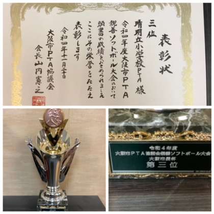 大阪市PTA親善ソフトボール大会第3位、賞状とトロフィーが3人の先生方にPTA代表として授与されました。