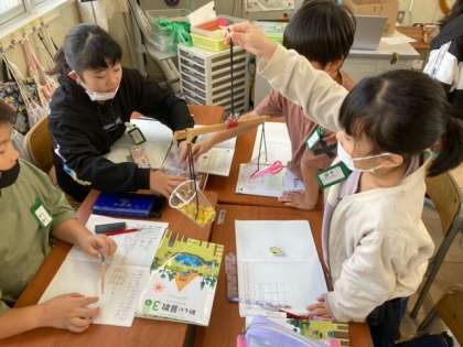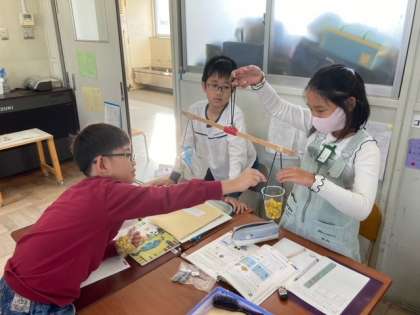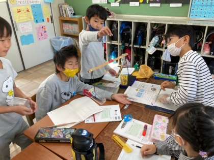 天秤を使い、どちらが重たいのかを調べました。そして、積み木が何個分かを調べ、重さを数で表しました。
