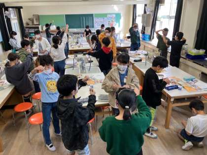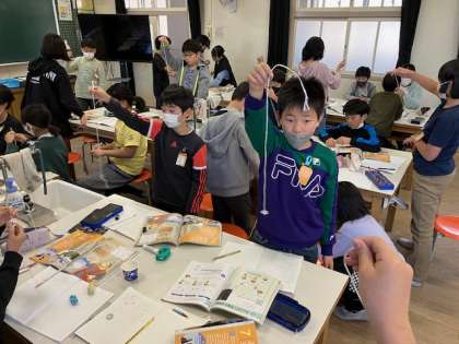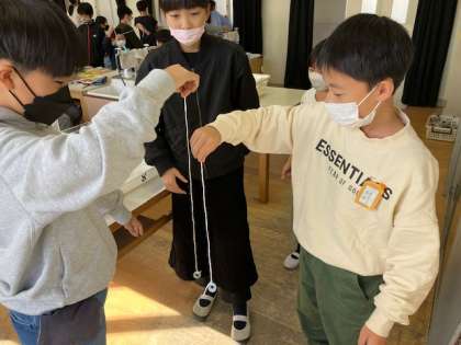 きまりを見つけようと、おもりの重さやふりこの長さを変えて、ふれ方のちがいを比べていました。友達のふりことシンクロさせたり、速さを競ったりもしていました。