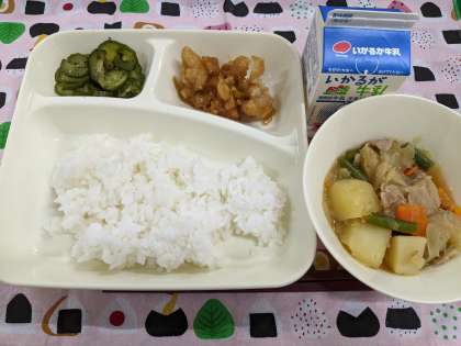 11月25日(金)のこんだては「あげどりのねぎだれかけ、豚肉とじゃがいもの煮もの、きゅうりの赤じそあえ、ごはん、牛乳」です。