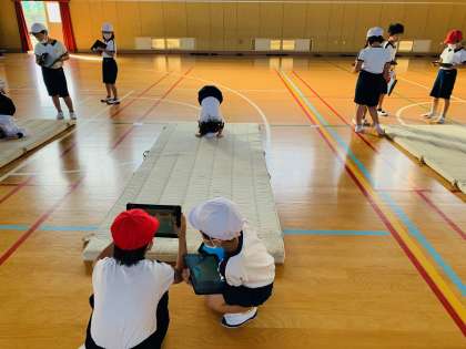 自分が前転や後転をしている様子を友達に撮ってもらい、確認しました。