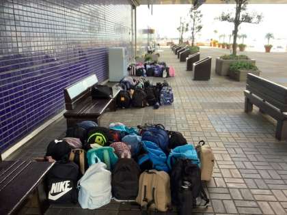 校長先生は、寒い中、みんなの荷物番をしています。