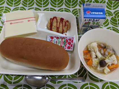 12月1日(木)のこんだては「とうふハンバーグ、カリフラワーのスープ煮、スライスチーズ、黒糖パン、牛乳」です。