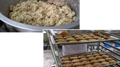 とうふハンバーグはとうふ、ツナ、たまねぎと調味料を混ぜ合わせ、1人1個ずつにまとめ、焼いています。ふんわりとやわらかく、やさしい味のハンバーグです。ケチャップをかけて食べます。