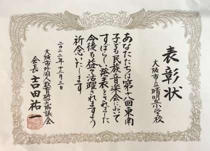 第18回東南子ども民族音楽会に2名が参加、素晴らしい発表に表彰状が贈られました。