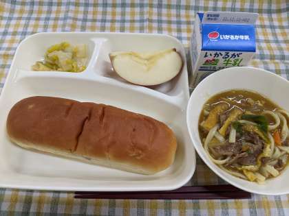 12月6日(火)のこんだては「カレーうどん、はくさいのおひたし、りんご、おさつパン、牛乳」です。