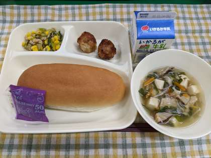12月8日(木)のこんだては「あげシューマイ、中華スープ、ツナとチンゲンサイのいためもの、コッペパン、ブルーベリージャム、牛乳」です。