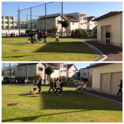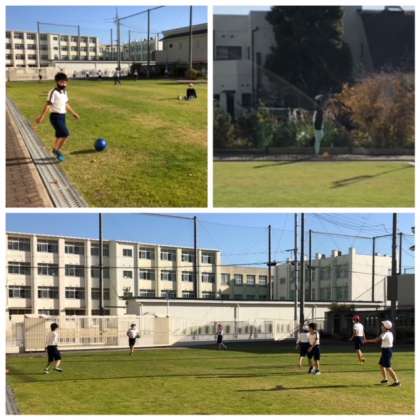 5年生が芝生広場で、だるまさんがころんだ、サッカー、ドッジボールなどをして楽しんでいました。フカフカの芝生ではだしになっている姿も。
