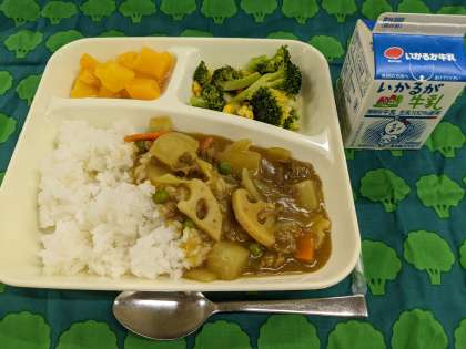 12月21日(水)のこんだては「冬野菜のカレーライス、ブロッコリーとコーンのサラダ、黄桃(缶)、牛乳」です。