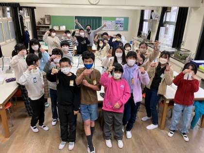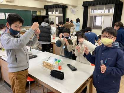 レインボー食塩水をつくりました。濃さのちがう食塩水に色をつけて、スポイトでゆっくりと試験管の中に入れていきました。