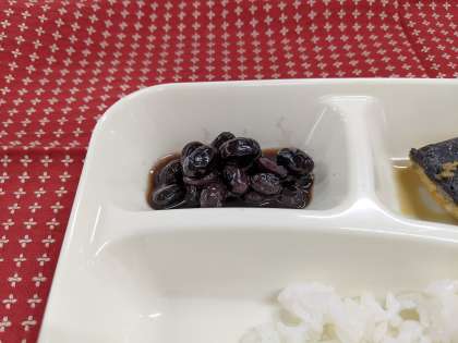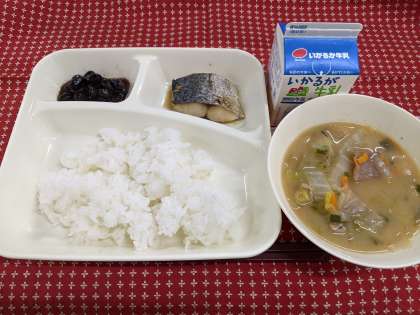 1月18日(水)のこんだては「さごしのしょうゆだれかけ、みそ汁、黒豆の煮もの、ごはん、牛乳」です。