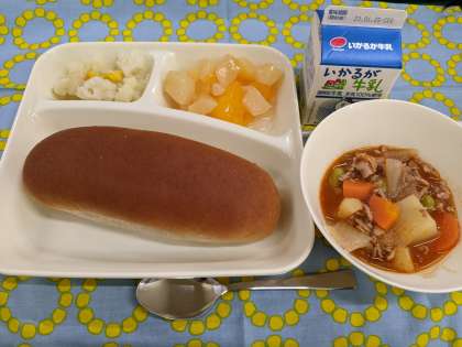 1月19日(木)のこんだては「豚肉と野菜のケチャップ煮、カリフラワーのピクルス、フルーツゼリー、黒糖パン、牛乳」です。