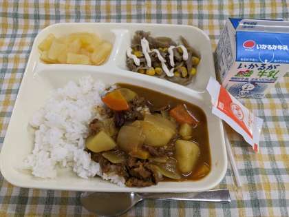 1月25日(水)のこんだては「牛肉と金時豆のカレーライス、ごぼうサラダ、パインアップル(缶)、牛乳」です。
