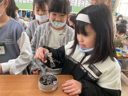 磁石につけた鉄は磁力を持つのかを実験しました。クリップや鉄に磁石を付けた後に磁石になっていて驚いていました。一つの磁石で幾つのクリップを持ち上げられるか競っていました。