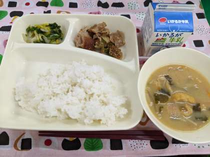 1月31日(火)のこんだては「豚肉のごまだれ焼き、みそ汁、きくなとはくさいのおひたし、ごはん、牛乳」です。