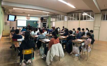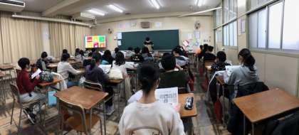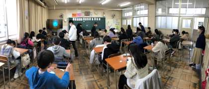 2月1日(水)、6年生は午後から阪南中学校へ出かけ、中学校の教室で中学校の先生から授業を受ける貴重な体験を行いました。