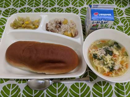 2月7日(火)のこんだては「中華おこわ、卵スープ、キャベツのオイスターソースいため、黒糖パン、牛乳」です。