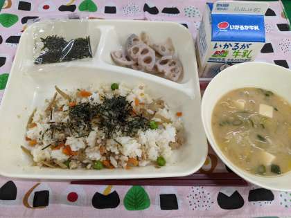 2月8日(水)のこんだては「鶏ごぼうごはん、とうふのみそ汁、焼きれんこん、牛乳」です。