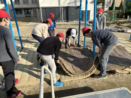 その活動の中で、うんていの下に敷いていたマットがボロボロで危険だということに気付き、みんなで協力して重たいマットの撤去を行いました。