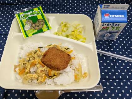2月13日(月)のこんだては「カツ丼、はくさいの甘酢あえ、まっ茶大豆、牛乳」です。