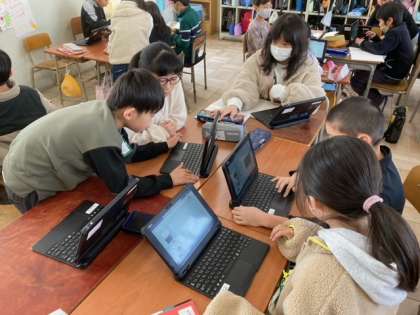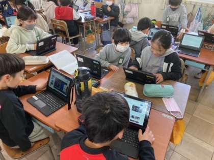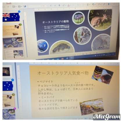外国についてタブレットを使い調べました。調べたことは班ごとにパワーポイントでまとめました。「有名な食べ物は何だろう?」「このスポーツしってる!」