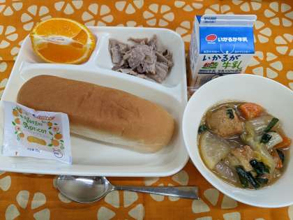 2月17日(金)のこんだては「豚肉のオイスターソース焼き、あつあげと野菜の中華煮、デコポン、コッペパン、アプリコットジャム、牛乳」です。