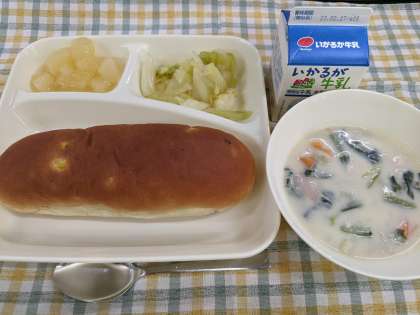 2月21日(火)のこんだては「ほうれんそうのクリームシチュー、キャベツのサラダ、洋なし(缶)、おさつパン、牛乳」です。