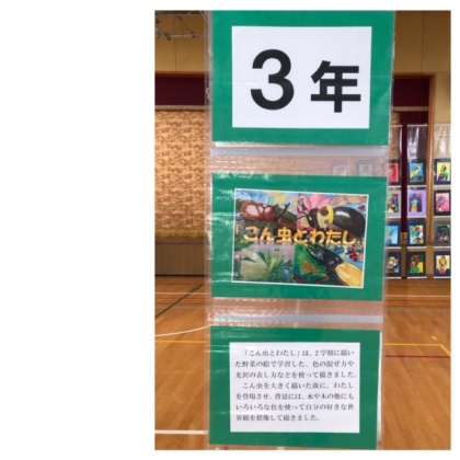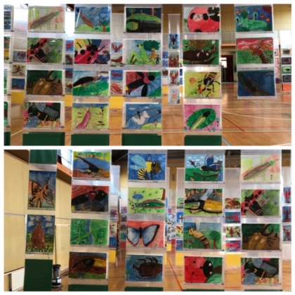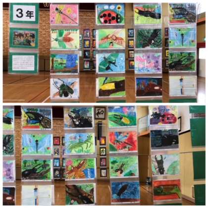 「こん虫とわたし」は、2学期に描いた野菜の絵で学習した、色の混ぜ方や光沢の表し方などを使って描きました。