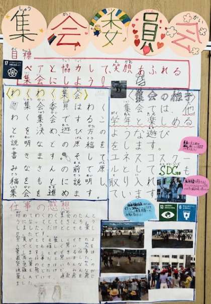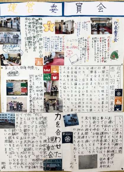 作品展の会場(講堂)の横壁を利用して、各委員会の活動報告の新聞を掲示しています。