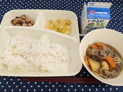 3月1日(水)のこんだては「肉じゃが、はくさいのゆず風味、とら豆の煮もの、ごはん、牛乳」です。
