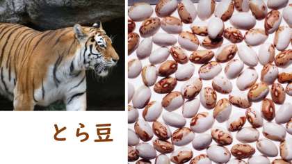 とら豆はいんげん豆の仲間です。半分が白く、もう半分が薄茶色に茶色の斑点が入り、とらのような模様になっています。柔らかくて煮えやすく、ねばりがあっておいしいことから「煮豆の王様」とも呼ばれます。