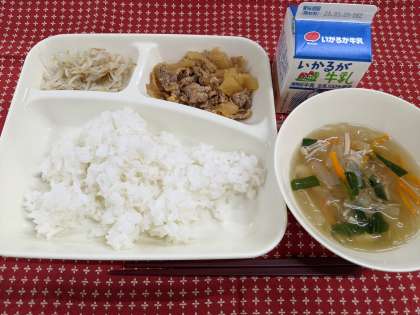 3月3日(金)のこんだては「豚肉のコチジャンいため、鶏肉とはるさめのスープ、もやしのナムル、ごはん、牛乳」です。