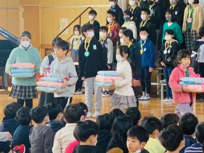 子ども達は、6年生からのプレゼントを嬉しそうに開け、ぞうきんを1枚1枚、大事そうに手に取っていました。