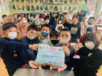 2年生は、呼びかけと歌で、6年生に「ありがとう」と「おめでとう」の気持ちを精一杯伝えることができました。